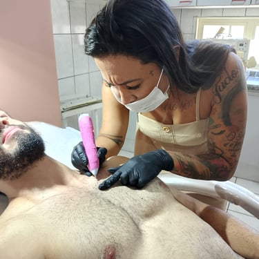 Com conhecimento em perfurações corporais, realizando piercings com técnica precisa, segurança e total cuidado com a saúde do cliente. Atua com aplicação de intradermal, tragus, nariz, orelha, umbigo, sobrancelha e mamilos, sempre utilizando materiais esterilizados e procedimentos rigorosos, garantindo um resultado bonito, seguro e de excelente cicatrização.