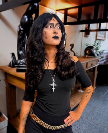 Seu estilo transita entre o gótico e o delicado, combinando intensidade, simbologia e traços finos com sensibilidade estética. Cada trabalho carrega identidade, personalidade e significado.